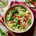 This vibrant Thai curry noodle soup combines aromatic green curry paste with succulent prawns, fresh stir-fry vegetables, and creamy light coconut milk, served over udon noodles. It’s a quick and flavorful meal that balances spicy, creamy, and fresh elements, perfect for a cozy yet refreshing dinner.