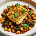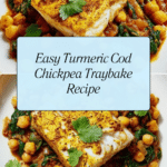 This vibrant Turmeric Cod with Chickpea Traybake is a flavorful and healthy one-pan meal featuring tender cod fillets nestled atop spiced chickpeas and spinach. Infused with turmeric, garlic, and ginger, and baked to perfection, it makes for a quick and nourishing dinner that combines protein, fiber, and warming spices in a wholesome traybake.