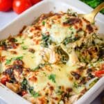 This Tuscan Garlic Chicken recipe features tender boneless skinless chicken breasts baked with garlic, fresh spinach, artichoke hearts, sun-dried tomatoes, and mozzarella cheese for a rich, flavorful dish that perfectly highlights classic Tuscan ingredients.