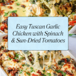 Tuscan Garlic Chicken is a flavorful and comforting dish that combines tender chicken breasts with vibrant sun-dried tomatoes, spinach, and creamy mozzarella. Easy to prepare and perfect for a cozy dinner, this recipe brings the taste of Tuscany right to your kitchen.