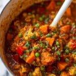 - Add Tomato, Broth, Potato, and Cauliflower: Pour in the crushed tomato and vegetable or chicken broth, then add the cubed sweet potato and cauliflower florets. Stir well to combine. Bring the mixture to a simmer, cover the pot, and reduce heat to medium.