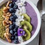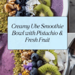 This vibrant smoothie bowl features a creamy blend of steamed purple yam, frozen bananas, Greek or coconut yogurt, and pistachio, topped with fresh berries, kiwi, granola, chopped pistachios, coconut flakes, and optional edible flowers or microgreens. It’s a nutritious, colorful breakfast or snack option that balances natural sweetness with crunchy textures.