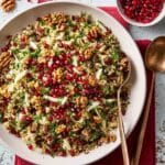 This vibrant Winter Tabbouleh salad is a refreshing twist on the classic Middle Eastern dish, featuring wholesome bulgur wheat combined with finely chopped cauliflower, fennel, fresh herbs, toasted walnuts, and a medley of dried and fresh fruits. The salad is dressed with a bright and aromatic pomegranate molasses dressing infused with garlic, cumin, and cinnamon, creating a harmonious blend of flavors perfect for a healthy, seasonal meal or side dish.
