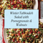 Keywords: winter tabbouleh, bulgur wheat salad, pomegranate molasses dressing, Middle Eastern salad, healthy vegetarian salad, cauliflower tabbouleh, seasonal salad