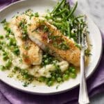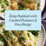 This vibrant Zesty Haddock recipe features tender white fish fillets pan-fried to perfection and served alongside fluffy crushed potatoes mixed with sweet peas. Enhanced by a bright lemon, caper, and chive dressing, it’s a fresh and flavorful dish perfect for a wholesome lunch or dinner.